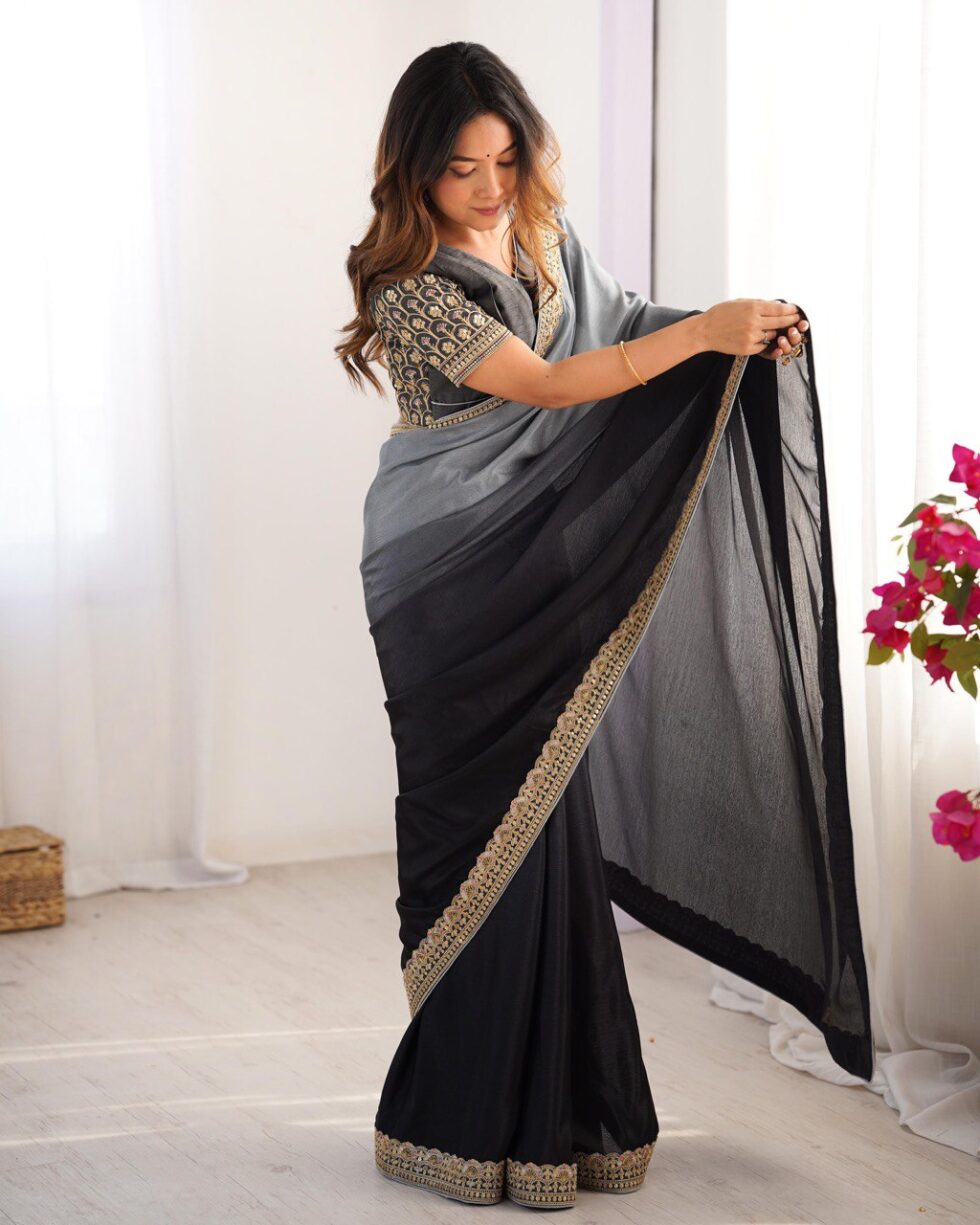 Women’s Elegant Ombre Green Georgette Saree with Intricate Golden Zari & Stone Embellishments – Complete with Heavily Worked Blouse for Festive & Wedding Wear