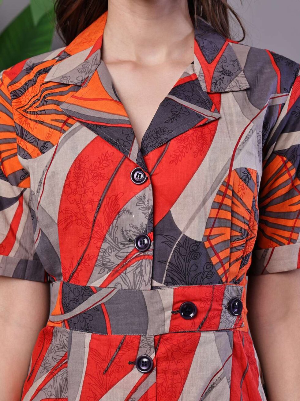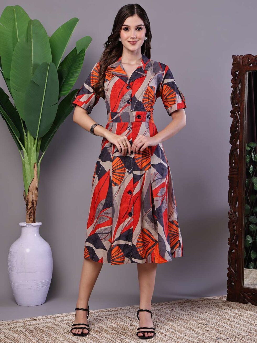 Women’s Leaf Print Button-Down Cotton Midi Dress
