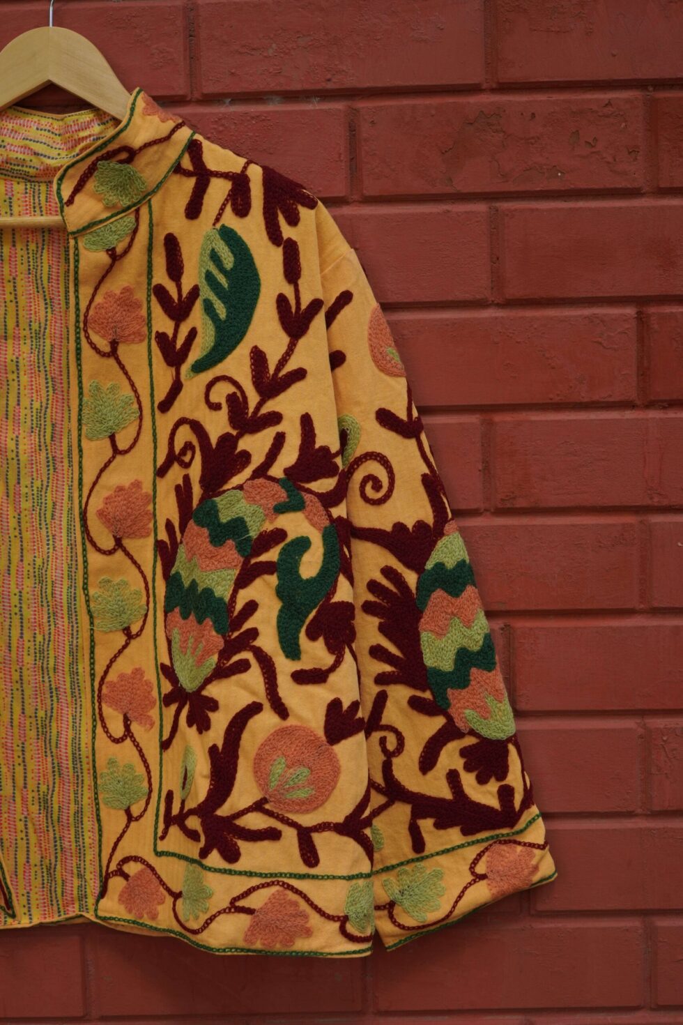 Womens Yellow Velvet Embroidered Jacket with Floral Design